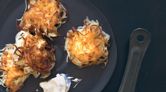 4Mélangez la crème fraîche, la ciboulette hachée et le zeste de citron dans un bol. Servez avec les galettes.