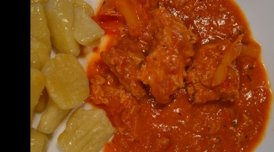 4Ajouter le poivron coupé en lanière, le fond de veau, le thym, le concentré de tomates, les tomates pelées, le vin blanc, le sel et le poivre. Lancer le programme MIJOTAGE 30mn/ vitesse 1A/ 100°C