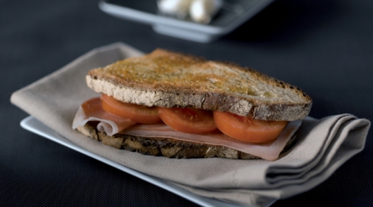 2Disposez 3 tranches de tomates et 1 de jambon de pays sur une tranche de pain. Assaisonnez de poivre.