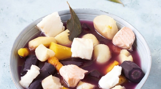 3Ajoutez les patates douces et les panais dans le bol inox et placez les filets de poisson sur le plateau du panier vapeur. Installez-le sur le bol inox, lancez le programme VAPEUR, 15 minutes en laissant les légumes finir de cuire dans leur bouillon.