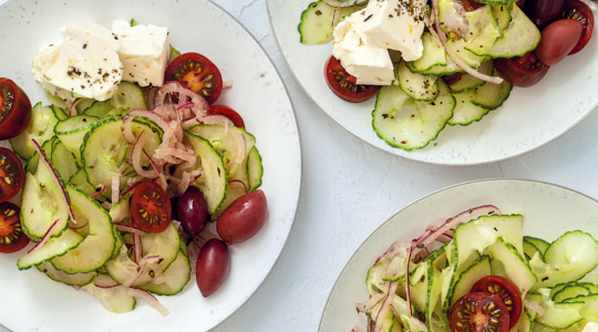 5Ajoutez le concombre, les tomates coupées en deux, les olives et la feta grillée coupée en cubes.