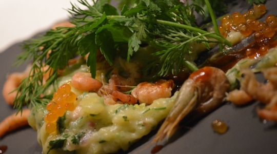 6Dressez une quenelle de purée, décorez avec le fond de veau, les crevettes grises, les oeufs de truite et les herbes fraîches.