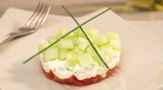 8Sur chaque assiette, posez un cercle. Garnissez le cercle d'une couche de tomates, puis une couche de mélange au chèvre frais. Finissez par une couche de concombres. Servez frais.