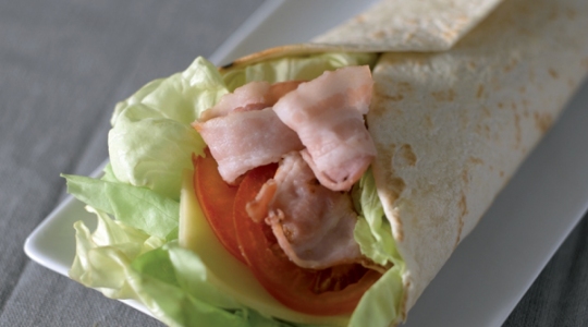 2Disposez au centre de chaque tortilla, 2 tranches de bacon, 3 rondelles de tomate, 1 tranche de fromage et 2 feuilles de laitue. Assaisonnez de poivre.