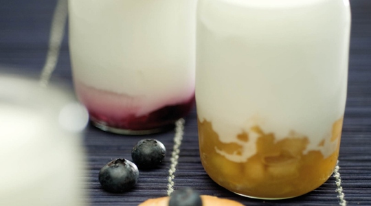 2Dans un saladier, mélangez le lait avec le yaourt et répartissez le mélange dans les pots.