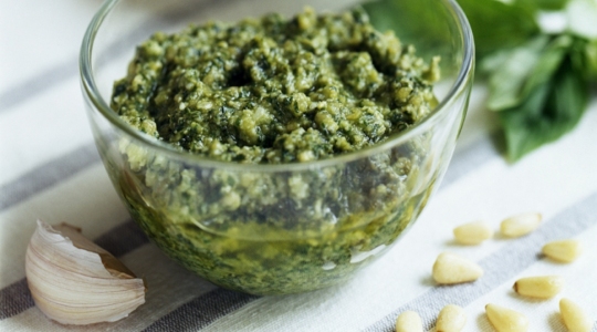 2Verdeel de basilicum, knoflook en pijnboompitten over de kom, zet de Magimix aan en giet de olijfolie er langzaam bij. Breng de pesto op smaak met peper en zout.