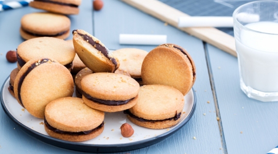 Breng met een spuitzak of theelepel een bolletje ganache aan op een van de koekjes. Plaats er een ander koekje op om kleine sandwichkoekjes te maken.