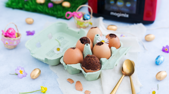 Schuif de eitjes in de oven gedurende 15 à 20 min afhankelijk van de sterkte van je oven. Test of de egg cake brownie gaar is door erin te prikken. Als een tandenstoker er droog uit komt, is de egg cake brownie gaar.